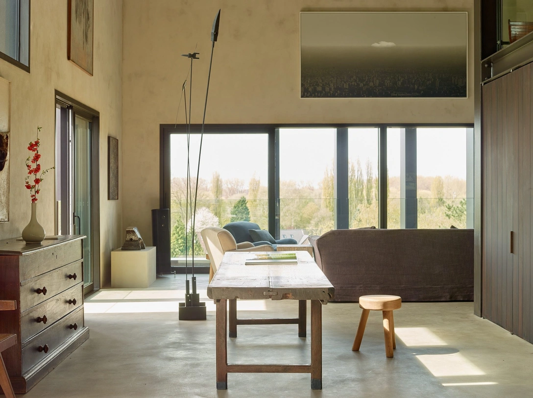 Эта двухэтажная квартира площадью 270 кв.м находится на верхнем этаже бывшего склада, преобразованного в жилье студией Coussée & Goris. Интерьер во многом определила архитектура здания. Дизайнеры оставили открытыми металлические колонны, которые сочетаются с отделкой из дерева и известковой штукатуркой.