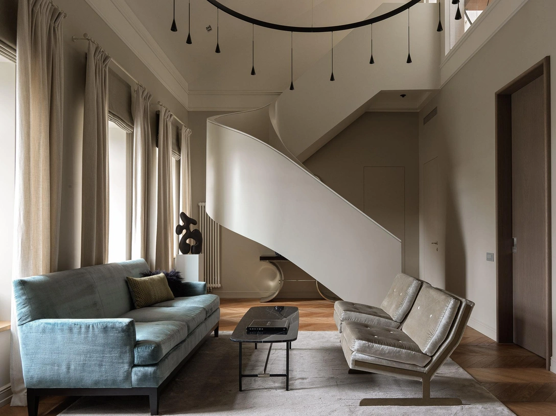 Апартаменты попали к новым владельцам в виде белых комнат с утраченной лепниной, но с высоченными потолками и красивым дубовым паркетом. Работу над интерьерами поручили дизайнеру Марии Бирюковой, основательнице студии MC Interior.