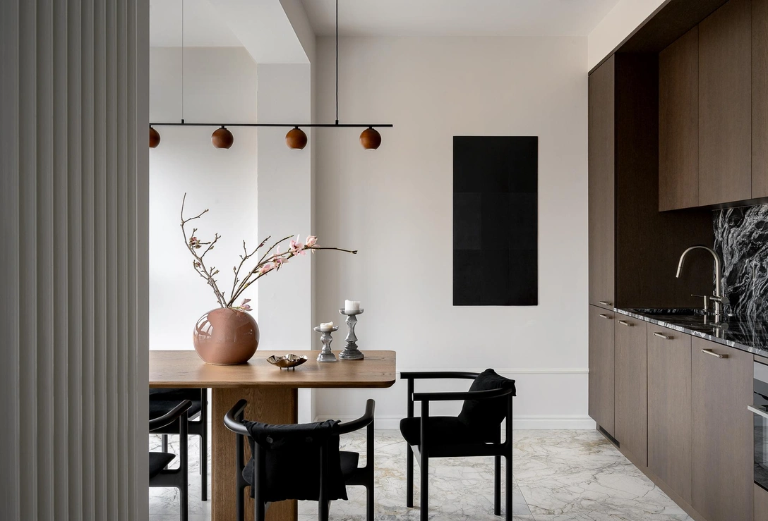 «Практически все пространство выполнено в приглушенных сероватых оттенках, которые придают интерьеру нотки драматизма и подчеркивают природные материалы: дуб, бразильский гранит, натуральный эвкалипт. Классические молдинги на стенах добавляют легкости и элегантности, создавая чуть уловимый парижский шлейф».