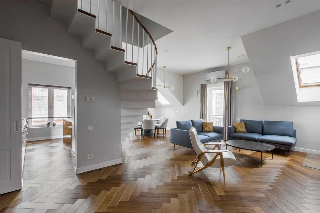 Эта двухуровневая квартира находится в Жверинасе, престижном районе Вильнюса, где современные жилые комплексы сочетаются с деревянной архитектурой начала XX века. Перед дизайнерами из YCL studio стояла задача создать уютный и лаконичный интерьер, соответствующий образу жизни владельцев. Они постарались впустить в дом максимум света и воздуха и организовать общественные зоны для разных случаев — будь то семейный обед или шумная вечеринка с друзьями.
