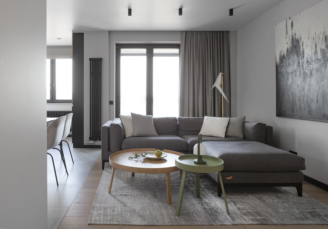 В гостиной главное место занимает удобный, мягкий диван, возле которого на стене висит картина в серых тонах, которую дизайнер нарисовала сама для этого проекта. Кухню выбрали белую с деревянными фасадами. Лаконичный потолочный светильник над обеденным столом для четырех человек добавляет пространству графичности. В квартире на момент разработки проекта было много выступов, которые дизайнеры старались грамотно перекрыть. На кухне такой выступ стал местом для обустройства дополнительного шкафа для хранения.