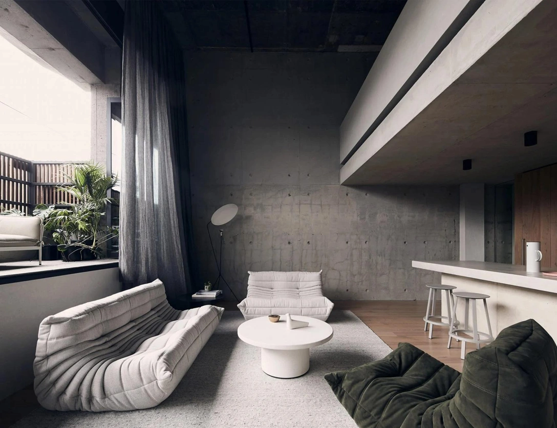 Эти апартаменты занимают первый этаж коммерческого здания 1970-х годов, которое было недавно переоборудовано под жилье. Вдохновившись строгим обликом фасада, характерным для бруталистской архитектуры, местное бюро Studio Goss решило сделать акцент на оригинальной фактуре бетона и чистых формах. «Глядя на этот проект, легко убедиться в том, что бетонная квартира — вовсе необязательно холодная и неуютная», — добавляют архитекторы.