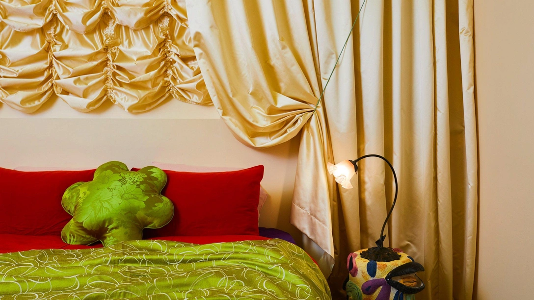 Конструкция стола соединена с конструкцией кушетки, чья волнообразная спинка повторяет линии интерьера. На ее зеленой обивке — разноцветные шелковые подушки в форме цветов. Над кроватью висят декоративные медузы, на фоне которых — россыпь золотых звезд.