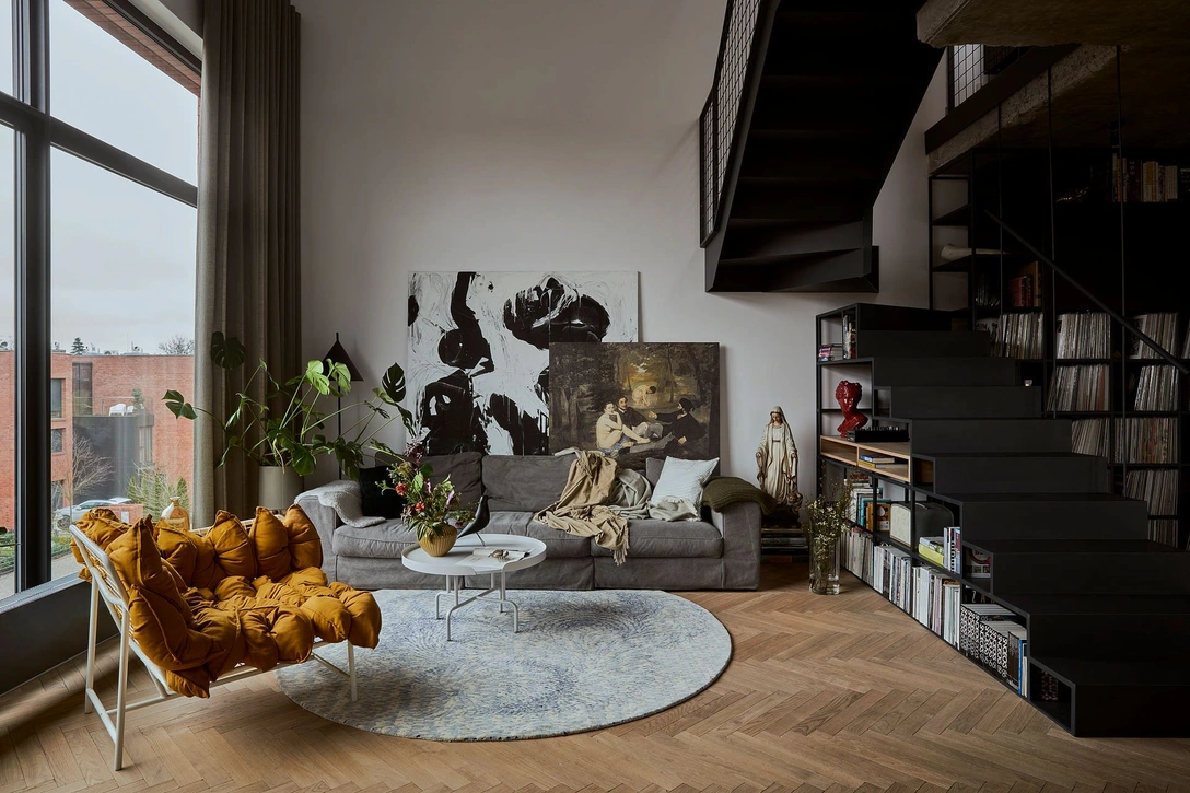Демонстративный эклектизм решений подчеркнут грубым бетоном мезонина, который решили оставить нетронутым, и выбором произведений искусства, классических и современных, будто намеренно сведенных вместе в противопоставлении.