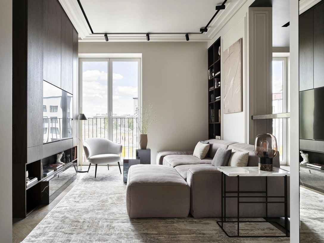 После нескольких встреч и обсуждения будущего интерьера было решено, что в нем будут присутствовать некоторые элементы классики. «Эту квартиру нельзя представить себе без лепного декора», — уверена Дарья Соловьева. Лепные карнизы и молдинги отвечают за классику, четкие линии и сдержанный дизайн — за современность.