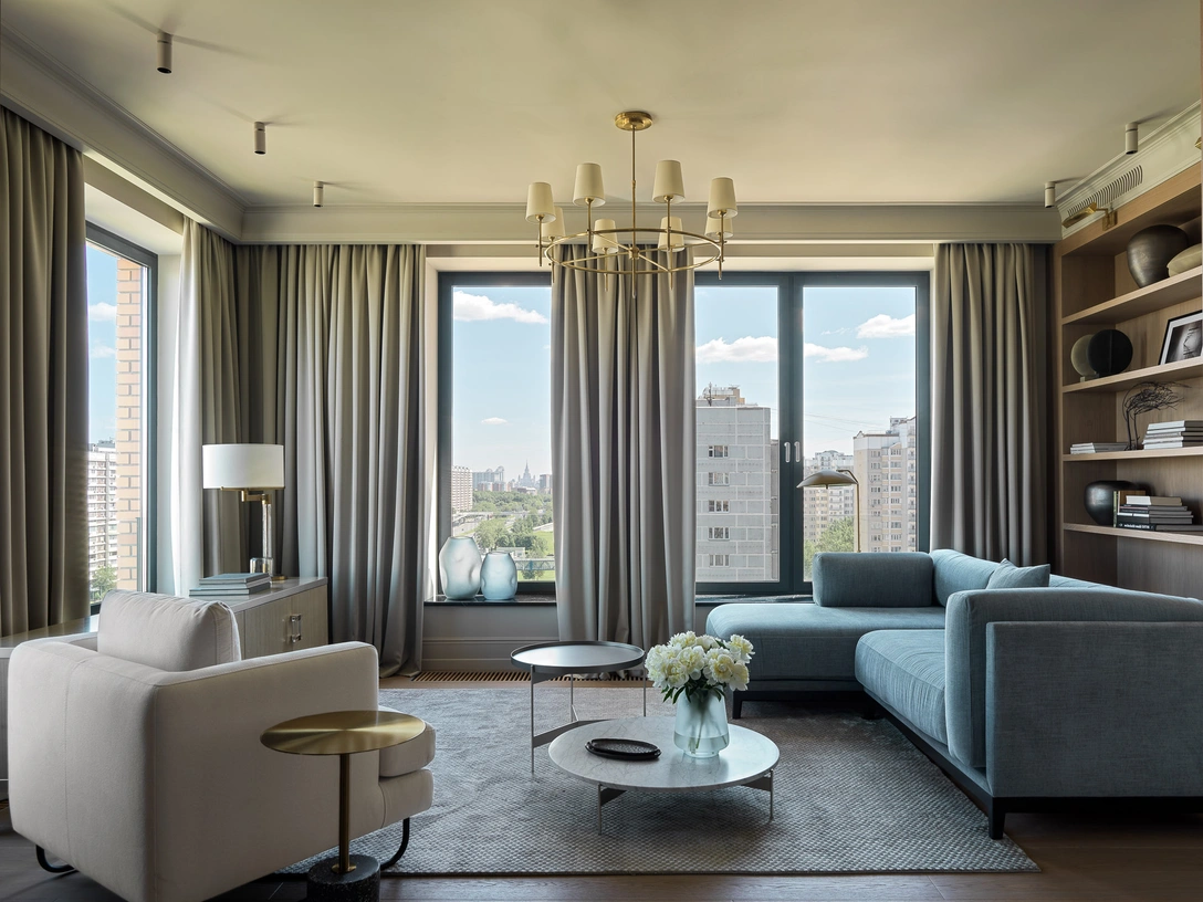 «Главное достоинство квартиры — большое количество окон. Почти в каждом помещении — даже в ванной комнате — есть хотя бы одно окно. Помимо очевидных преимуществ, это позволяет в течение всего дня наблюдать, как живет и меняется город. Тем более, что квартира расположена на 12 этаже, и из нее открывается чудесный вид на МГУ, Живописный мост и гребной канал».
