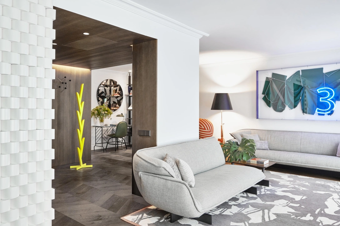 Важное место в интерьере занимает искусство. Стену у входа в спальню украшают скейтборды с яркими иллюстрациями Жана-Мишеля Баскии. Обстановку самой комнаты дополняют вдохновляющие предметы, такие как коллекция воротников рубашек, купленная на блошином рынке в Париже, и работа архитектора, художника, дизайнера и писателя Оскара Тускета.