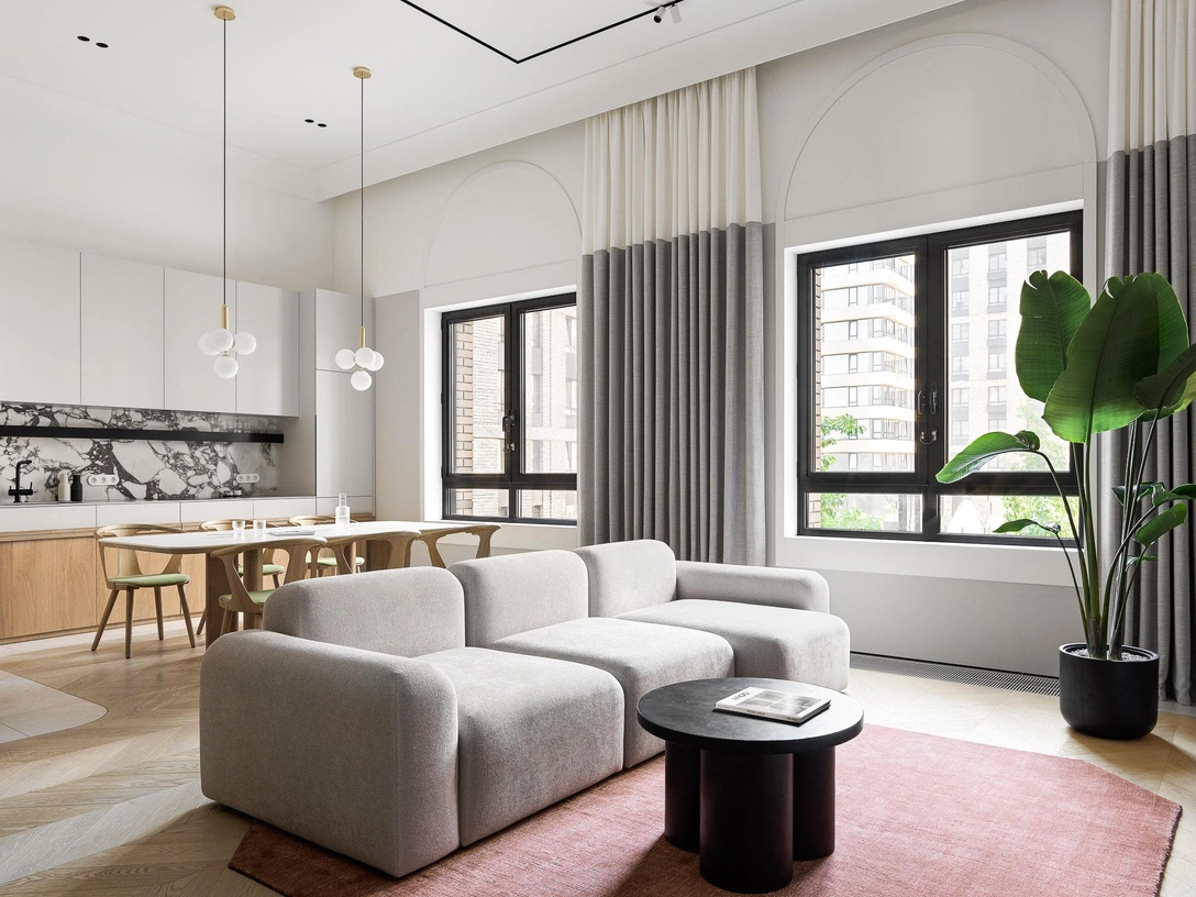 Одной из важных особенностей проекта, на наш взгляд, являются обрамления арочных проемов в гостиной. Эти элементы 3,5 метра в высоту, состоящие из нескольких деталей, стали главным вызовом для столяров.