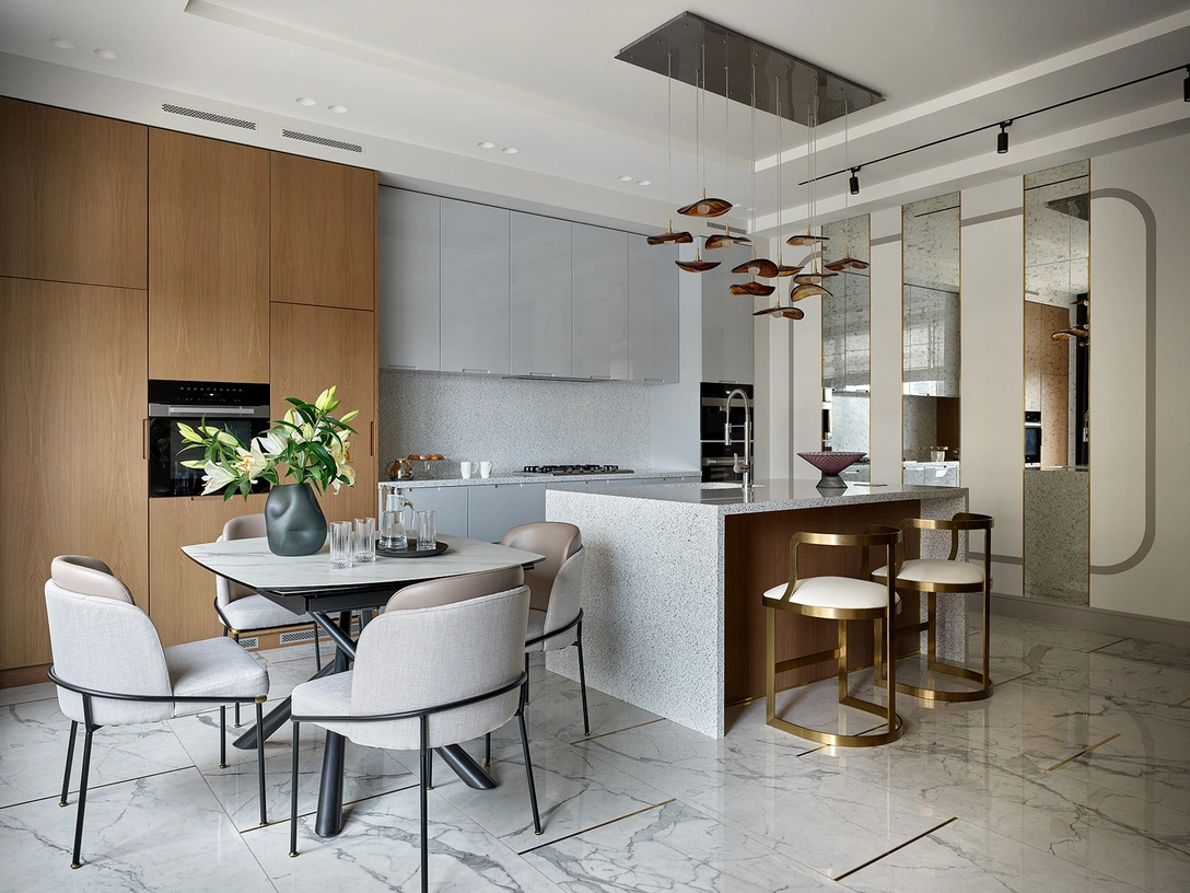 Интерьер выполнен в современном стиле. В основу цветовой гаммы легло сочетание спокойных природных тонов. Однако с самого начала мне хотелось добавить немного красного — так между кухней и холлом появилась легкая металлическая дверь в вишневой отделке. Ощущение тепла и уюта создает текстура натурального шпона: деревянные панели и элементы мебели можно увидеть в каждой комнате. Также мы добавили латунные и золотые детали. С помощью золотой краски нам удалось превратить выступающие несущие колонны в стильный акцент.