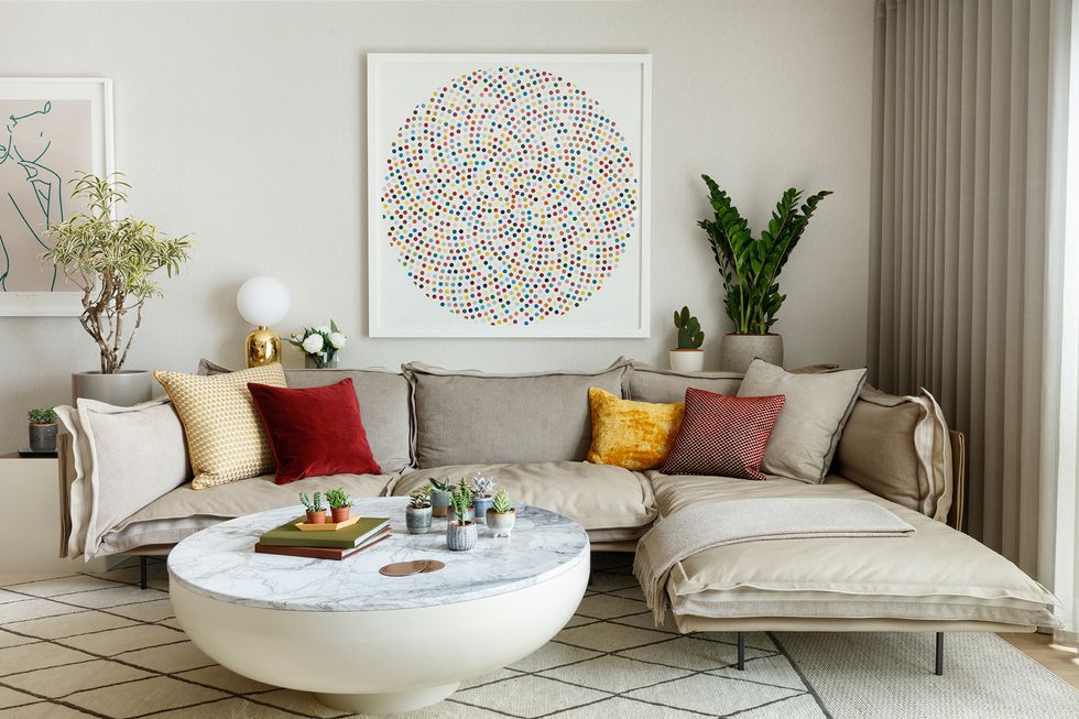 В качестве основной палитры выбраны спокойные и светлые бежево-коричневые оттенки, которые сочетаются здесь с полами и мебелью из светлого дерева. А чтобы интерьер не выглядел слишком скучным, дизайнеры добавили яркие акценты и фактуры — текстиль, ковры, рельефную обивку, произведения искусства и живые растения.