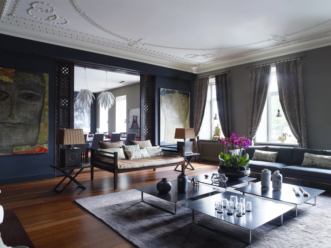 Работая в старинных домах, я придерживаюсь правила: бережно хранить и восстанавливать то, что смогло сохраниться, несмотря на издержки времени. Поэтому задача была крайне проста: оживляем дух времени внутри квартиры, плюс пропитываем его жизнью, запахами, музыкой, эмоциями, тенденциями и, конечно, искусством