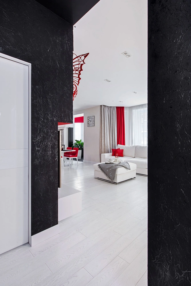 «Светлые поверхности контрастируют с черным цветом, а ведущим декоративным приемом стал насыщенный красный цвет. Он выглядит кричащим, поскольку помещен на белый фон, но общий образ квартиры получился утонченным и современным».