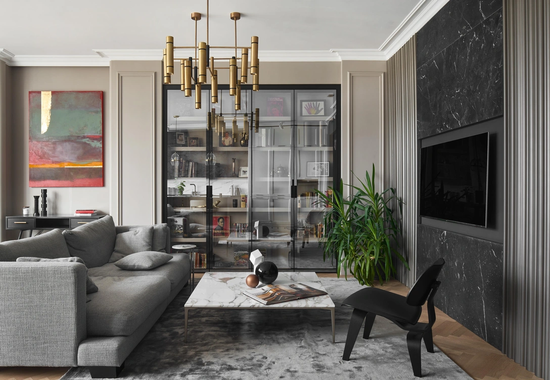 Заказчик — яркий, харизматичный мужчина — работает в сфере организации концертов звезд мировой эстрады. Ему хотелось комфортный, эргономичный, современный интерьер с яркими акцентами и элементами классики. Также он просил сделать достаточно систем хранения и использовать благородные натуральные материалы и палитру в темных, насыщенных оттенках. Все это и стало отправной точкой для работы над этим проектом.