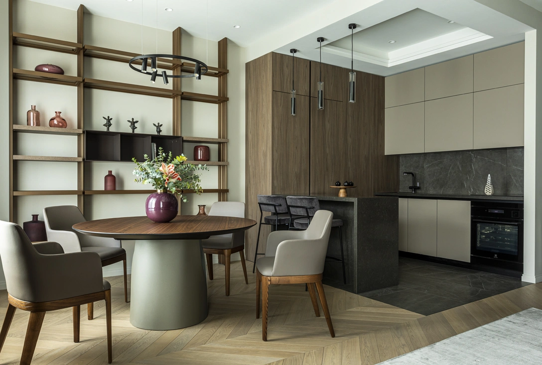 «Заказчик проекта — иностранец, среди главных пожеланий хотел видеть просторную гостиную, где он сможет устраивать большие дружеские вечеринки, — рассказывает архитектор Ирина Чернейкина. — В итоге зоне гостиной выделили больше трети квартиры — 36 м², совместив ее с кухней и столовой. Здесь же расположили дополнительное место для хранения, сделав встроенный от пола до потолка шкаф, куда можно спрятать все лишнее».