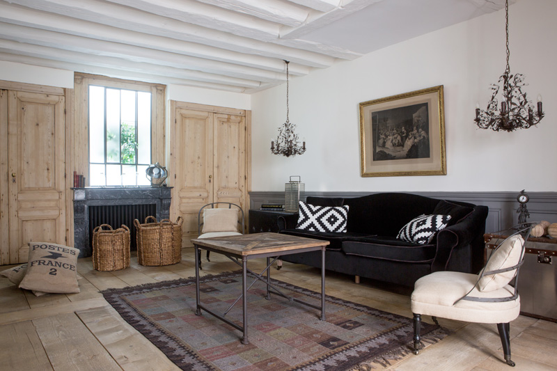 Стиль винтаж идеально вписался в этот интерьер. Старинные балки ошкурили и побелили, а в некоторых комнатах оставили некрашеными. Стены выкрасили в серый цвет, двери, наоборот, очистили от краски: древесина оказалась настолько красивой, что Карин решила не лакировать и не тонировать ее, а оставить в натуральном виде. Полы в холле выложили плиткой «под старину», а в жилых комнатах — широкими старыми досками: на самом деле это купленные по случаю полки из снесенного склада молочной фермы. Пока продолжались строительные работы, хозяйка, не теряя времени даром, подыскивала для интерьера мебель в стиле винтаж. На лионский блошиный рынок Les Puces des Canal она ходила регулярно, как на работу. Продавцы уже стали узнавать ее в лицо.