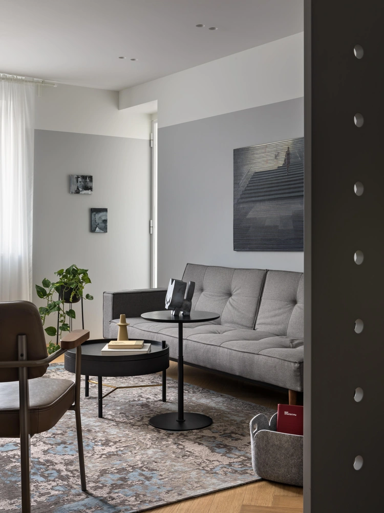 «Основными стилистическими приемами построения интерьера являются колорблоки и контрастные акценты, работающие по принципу композиционных „контрапунктов“. Общее настроение квартиры смягчается сдержанными нюансными отношениями серых оттенков и текстурой натурального дерева. Соседство „старого“ и „нового“ образует стилистический диалог и вызывает легкую ностальгию по эстетике советского авангарда».