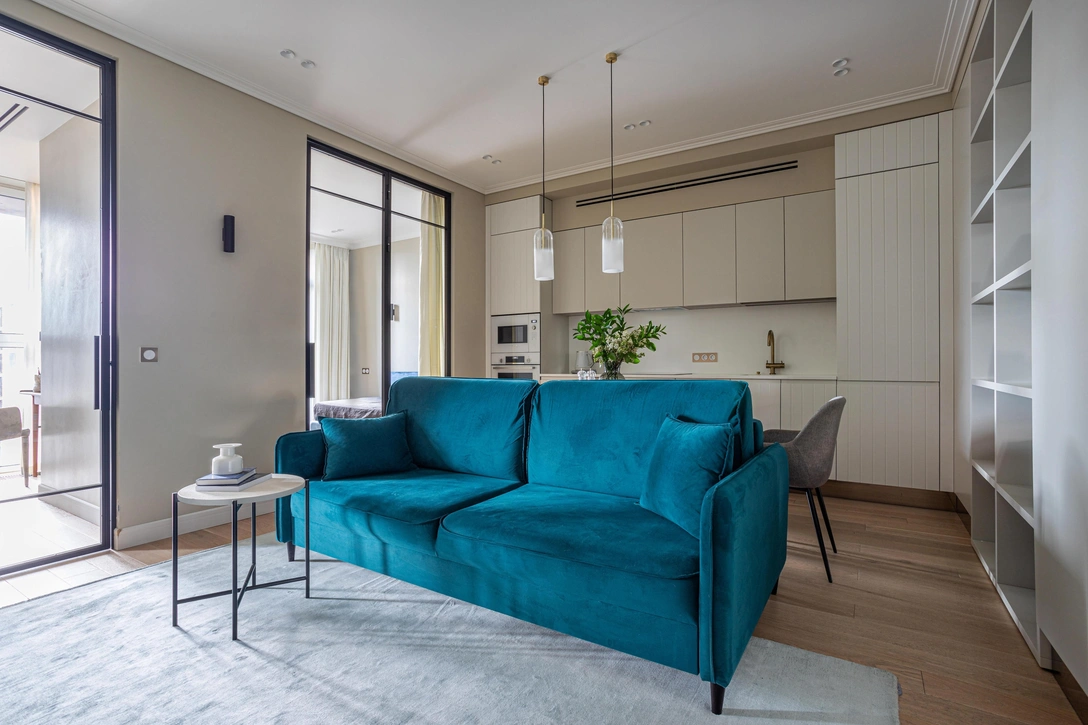Когда в квартире два окна, а помещений, которым нужен естественный свет, — три, неминуемо придется чем-то пожертвовать. Яна Волкова решила расположить в глубине кухню-гостиную, но устроить все так, чтобы она не осталась совсем без света.