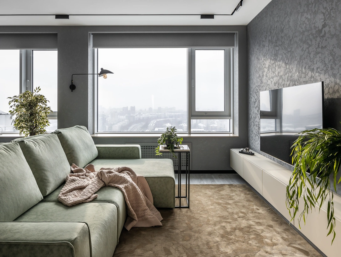 Главной особенностью и преимуществом квартиры, расположенной на 24 этаже самого высокого жилого комплекса города, стали панорамные окна с потрясающим видом. «Он как бы говорит: „весь мир у твоих ног!“, и именно это ощущение мы взяли за основу концептуального решения», — добавляет Эльмина.