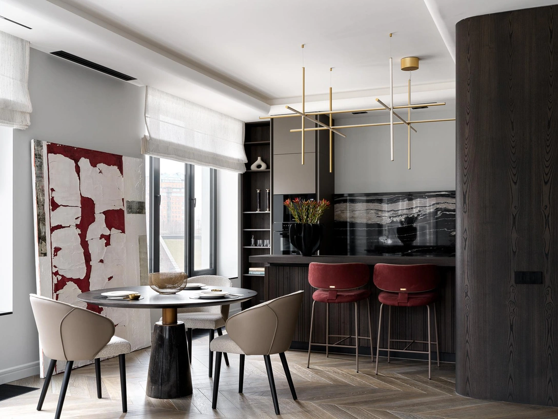 В гостиной цветовым акцентом стал красный — он присутствует в обивке барных стульев и на большой текстурной картине за обеденной зоной
