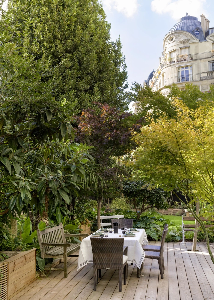 Квартира с собственным садом — редкость для Парижа. «Сразу появляется ощущение, что вы находитесь в доме где-нибудь на природе, а не в центре города в толпе людей на пересечении туристических маршрутов», — рассказывает Аликс де ла Комбл (Alix de la Comble), хозяйка апартаментов в 16-м округе Парижа. «Хотя в самом начале все выглядело не так радужно, как сейчас, — продолжает она. — На участке была запруда, скрытая под тиковым настилом, и крутой склон. В абсолютно заросшем саду мы с мужем чувствовали себя словно на дне оврага». Привести в порядок сад семья пригласила ландшафтного дизайнера Пьер-Александра Риссера (Pierre-Alexandre Risser). Он расчистил территорию, проложил дорожки, высадил на участке фруктовые деревья — яблони, груши, кусты смородины, разбил огород с кабачками и клубникой.
