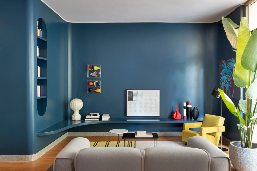 Цвет, ярко-синий снаружи и ледяной белый внутри, стал не просто инструментом для организации пространства, но и сильным декоративным акцентом. Можно сказать, мы создали новую точку опоры интерьера. Другой такой мощный элемент — огромное раздвижное окно в раме из ярко-золотого алюминия. Мы сохранили ее от прежнего интерьера, изменив теплоизоляционные характеристики».
