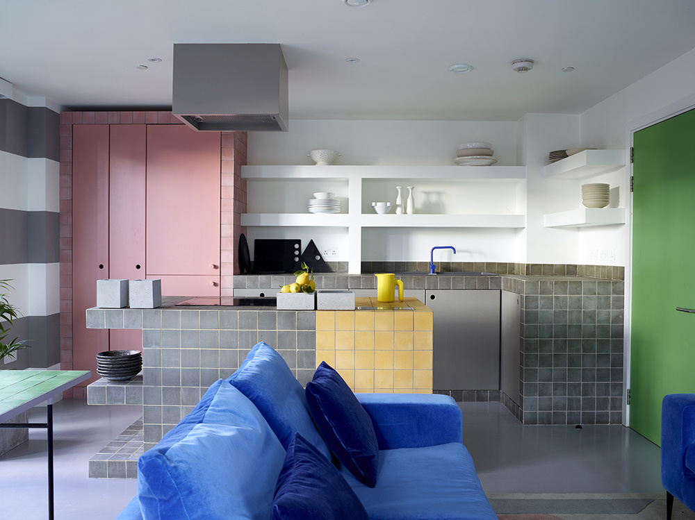 Шкафы, журнальные столики, прикроватные тумбочки и даже кадки для растений — во всей квартире не найти ни единого угла, где бы дизайнер Ронда Дрейкфорд (Rhonda Drakeford) не применила цементную плитку разных оттенков. Нежно-розовую — в отделке шкафов, синюю — в облицовке стен в ванной, зеленую, дымчато-серую и желтую — для «кухонного острова» и столешницы ... Яркая палитра и необычные геометрические формы — то, что автор проекта любила всегда, еще во времена совместной работы со своей напарницей дизайнером Лулу Ропер-Калдебек (Lulu Roper-Caldbeck).