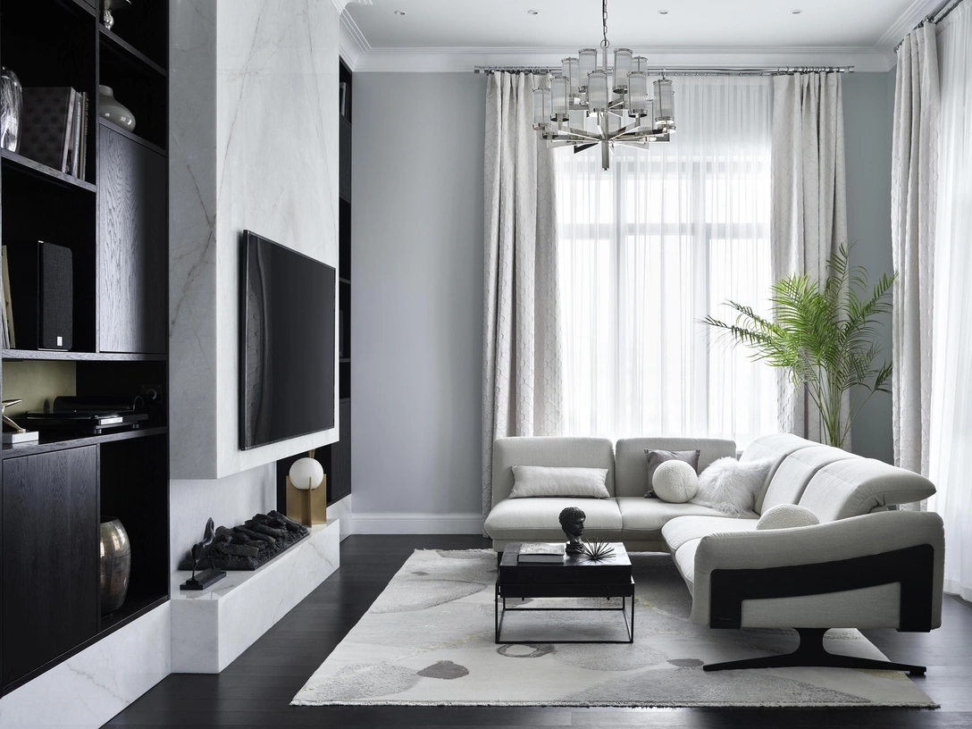 Большое пространство гостиной Юлия оформила в стиле современная классика с элементами арт-деко. У окон она расположила две мягких группы, напротив организовала ТВ-зону, которая выглядит как красивая стена из натурального камня, обрамленная стеллажами. Камень пришлось подбирать долго, непросто было найти слебы, которые бы подходили по размеру и цвету. В итоге, стеллажи и камень эффектно дополняют друг друга: композиция высотой 3,5 метра придает гостиной торжественность.