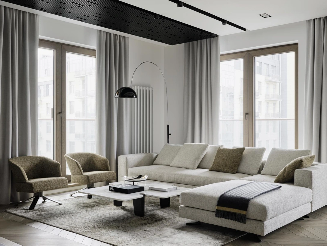 «Нам повезло с исходными данными, — говорит Денис. — Окна в пол, правильная геометрия, достаточно высокие для нового дома потолки — все это сразу подкупило нас. Планировка стандартна для площади 140 кв. метров: мы объединили кухню, столовую и гостиную в единое пространство, которое само собой задало динамику в расстановке мебели. Мы часто сами проектируем предметы обстановки для будущего интерьера. Например, в гостиной нам удалось создать множество зон скрытого хранения и даже потайную дверь. Она ведет в приватную часть квартиры, где находятся спальня, гардеробная и ванная комнаты. В кухне-столовой стоит обратить внимание на стол. Его мраморные ножки со скругленными краями выглядят так, будто выполнены из цельного каменного блока, но на самом деле это слэбы, соединенные между собой. А ванная комната напоминает хаммам, где приятно расслабиться после долгой рабочей недели, — почти все в ней создано по нашим эскизам».