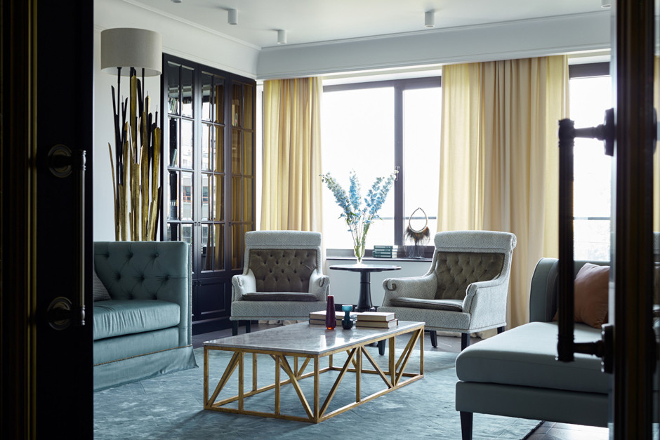 «Здесь под одной крышей живет сразу несколько поколений дружной семьи: семейная пара, их старший сын, его жена и пятилетний ребенок, – рассказывает дизайнер Катерина Лашманова. – Я постаралась создать интерьер, который придется по вкусу сразу всем поколениям. В качестве ответа на эту непростую задачу в квартире зазвучали жемчужно-голубые оттенки – очень спокойные и гармоничные, они подошли всем членам семьи и самому пространству с панорамными окнами».
