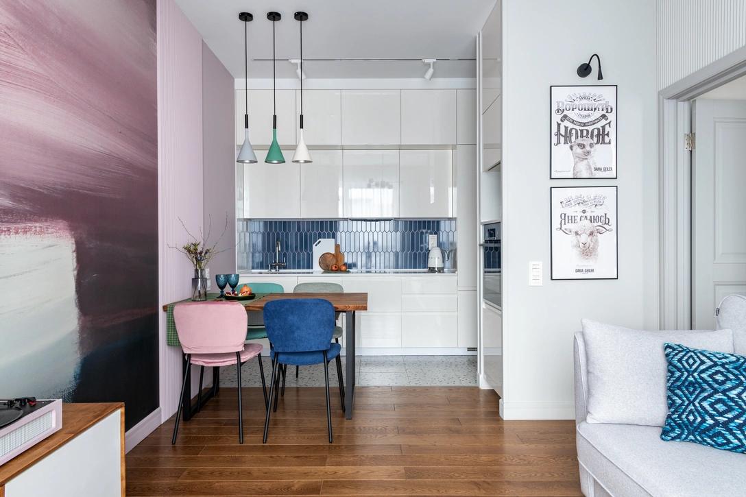 Чтобы визуально зонировать кухню-гостиную и нивелировать «эффект вагона» — вытянутого в глубь от окна помещения — длинную стену разделили при помощи фрески. За счет размашистых мазков она «собрала» стену и создала цветной акцент в зоне гостиной. А фрагмент 3D-панелей, с которым стыкуется стол, стал разделительной чертой между кухней и гостиной.