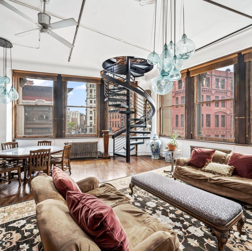 Двухуровневые апартаменты напоминают настоящую нью-йоркскую студию художника. В них три спальни, три полноценные ванные комнаты и гостевой санузел, высокие потолки в 3,5 м и эффектная винтовая лестница из стекла и стали. По лестнице можно попасть на верхний этаж, где расположена главная спальня с изготовленной на заказ кроватью, собственной ванной комнатой и гардеробной, а также домашним офисом. На нижнем уровне находится гостиная и столовая открытой планировки и просторная кухня, оснащенная винтажным бирюзовым холодильником.