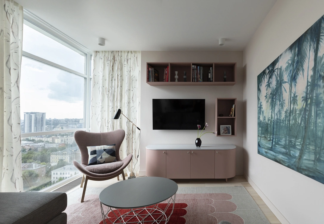 «Самое ценное и интересное в этом интерьере — это картины украинских художников. Например, на стене в гостиной расположилось произведение „Пальмовая роща“ Валерии Трубиной — киевской художницы, которая работала с творческой группой конца 1980-х начала 1990-х годов „Парижская коммуна“. Творчество Валерии совершенно свободно от любого рода социальных или политических тенденций и обращено к чисто эстетическим категориям — духовности в искусстве, ответственности художника и красоты как высшей ценности. Спальню мамы украшает картина одесского художника Юрия Плисса, которая привнесла в интерьер шик французского будуара».