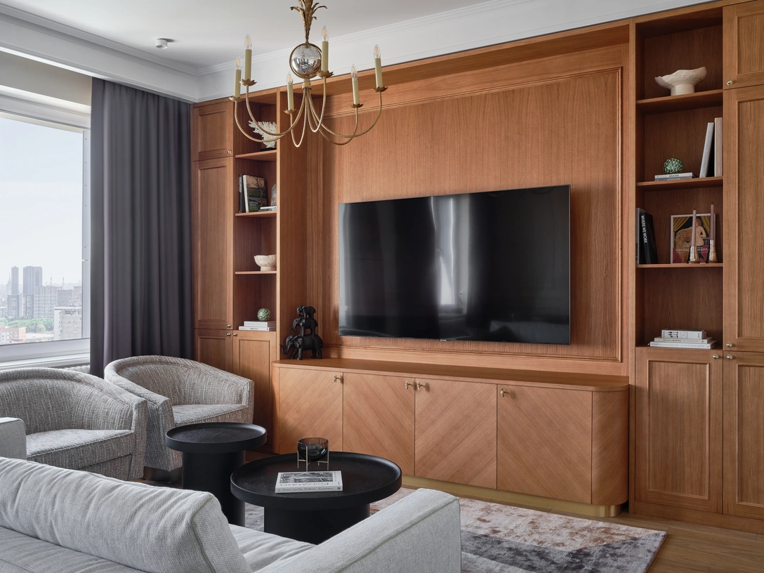 «Интерьер создавался для молодой семейной пары. Он — бизнесмен, она — дизайнер. Супруг очень любит классические интерьеры, что и стало отправной точкой в разработке проекта, — рассказывает автор проекта. — Квартира находится на высоком этаже и выходит окнами на три стороны, поэтому пространство изначально утопало в солнечном свете. Нам хотелось максимально сохранить это ощущение».
