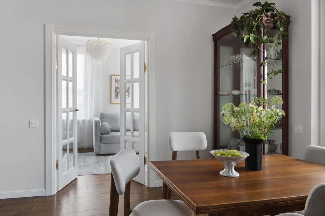 Заказчики проекта — зрелая семейная пара, их дети уже выросли и живут отдельно. Главным пожеланием было создать светлый интерьер в классическом стиле. Также хозяева попросили перевезти в новую квартиру винтажный сервант-витрину и румынскую банкетку для прихожей, с покупки которой 36 лет назад началось обустройство их первого семейного гнездышка.