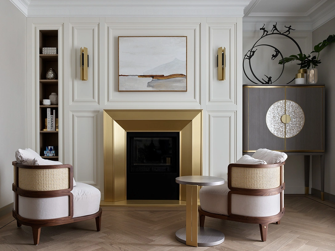 Неоспоримым плюсом стала возможность установки настоящего камина. Сразу была придумана каминная зона с креслами и баром в гостиной как место для теплых встреч гостей и членов семьи. Учитывая, что в отделке интерьера и мебели использованы разнообразные латунные детали, архитекторы решили сделать каминный портал также из латуни. Чтобы добиться идеального результата, камин пришлось переделывать несколько раз. Но это несомненно того стоило, и теперь хозяевам хочется возвращаться сюда все чаще и чаще.