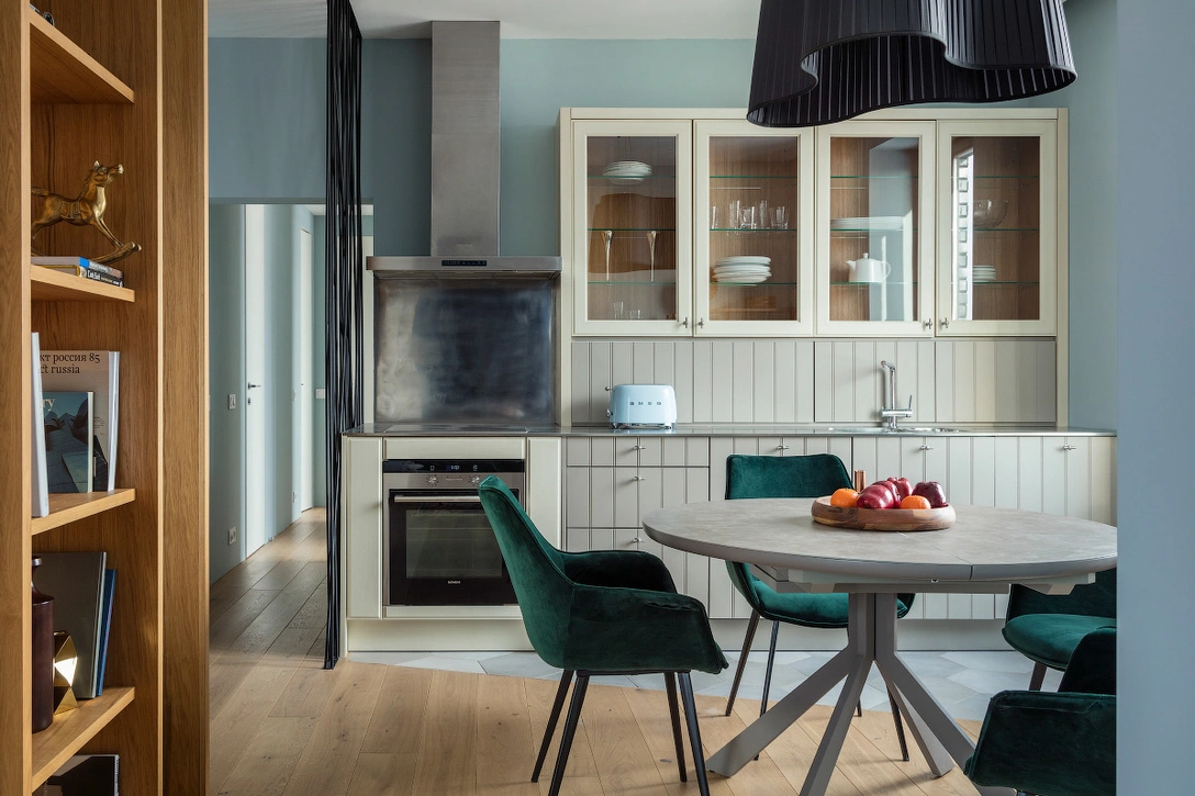 «Минималистичная, на первый взгляд, оболочка интерьера наполнена сложными фактурами, цветами и интегрированной в стены мебелью, — рассказывает архитектор Максим Кашин. — В оформлении комнат присутствует растительный орнамент, элементы ар деко, минимализма и американского кантри. Он звучит в типичной для американского стиля раскладке кухонных шкафов. Ар деко присутствует в интерьере гостиной, его поддерживают некоторые декоративные элементы на расположенной по соседству кухне. При этом ванные комнаты относятся скорее к стилистике рационального минимализма».