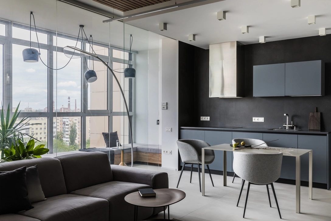 «Квартиру мы разделили на три помещения: кабинет, спальню и просторную гостиную, объединенную с кухней и балконом. Свободная планировка позволила обустроить интерьер с размахом и простором. Главным акцентом гостиной стал многоуровневый потолок, выполненный из материалов с разными фактурами, что помогло создать иллюзию высоких потолков».