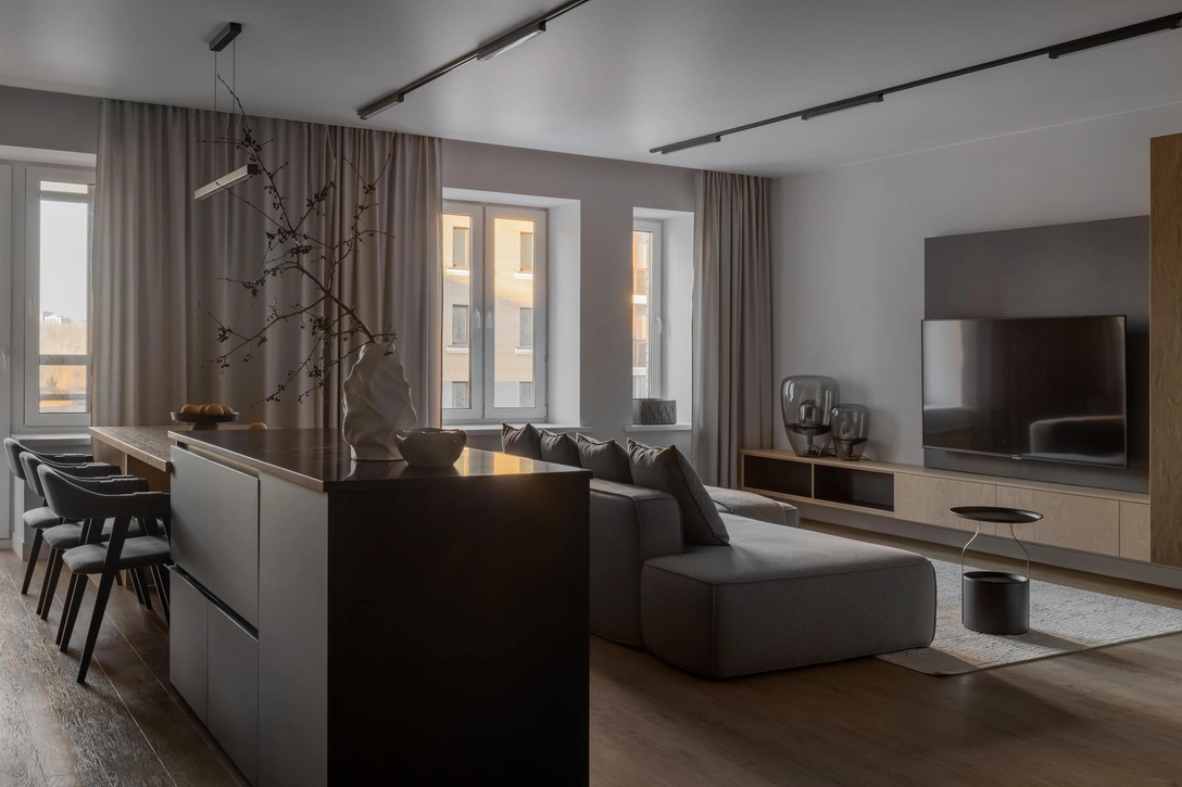 В зоне ТВ мы расположили телевизор на темном основании, продлив его геометрию в стеллаже. Так вся зона сложилась в цельную композицию, где каждая линия и форма имеет свою логику.