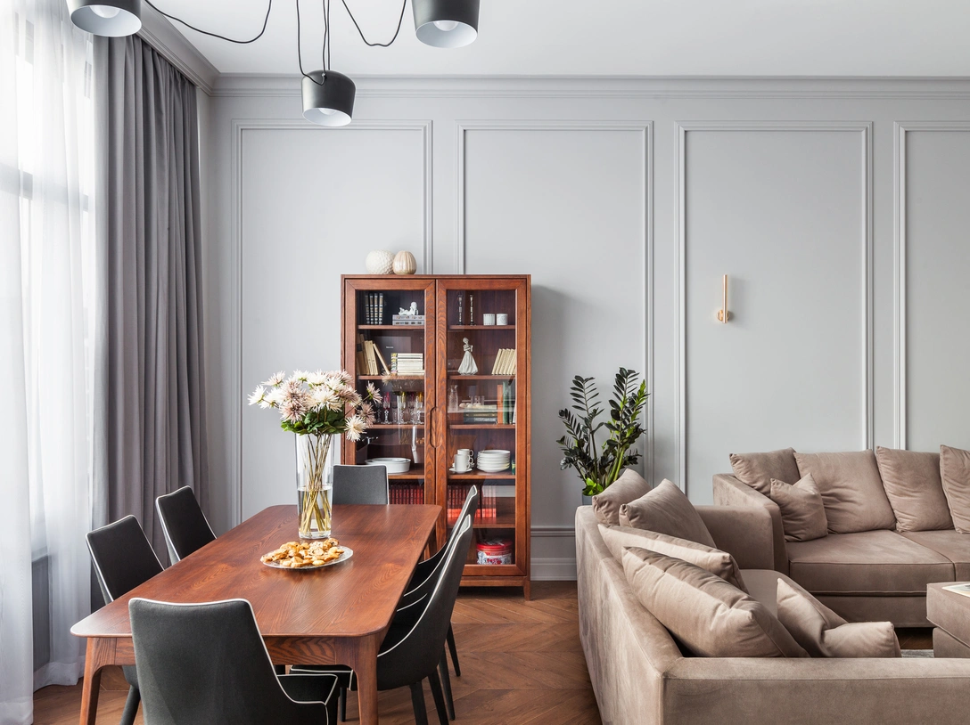 Декораторские приемы, использованные в оформлении этого интерьера: «Нейтральная гамма основных плоскостей помещения, акценты в деталях — текстиль, освещение, предметы искусства. Площадь квартиры относительно небольшая, и перегружать интерьер большим количеством элементов не хотелось».