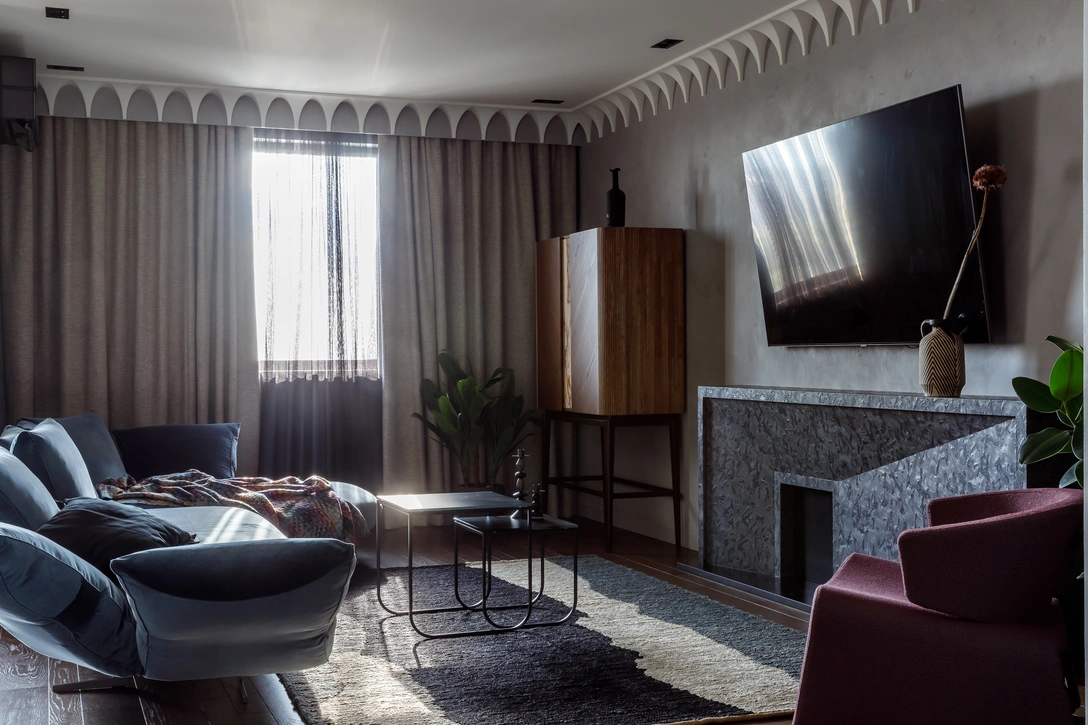 «Интерьер этой квартиры создавался для семейной пары с ребенком. У заказчиков были разные представления о том, как должен выглядеть их новый дом. Супругу нравится минимализм, серые оттенки и грубая фактура бетона, а жене по душе классические интерьеры с большим количеством модной мебели. Нашей задачей было найти компромисс и проектировать пространство, где будет комфортно всем членам семьи», — рассказывает дизайнер Яна Аспанадзе.