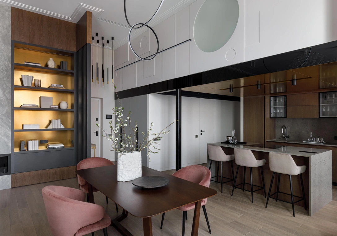 В этом проекте мы активно использовали архитектурные возможности квартиры — благодаря этому у нас получилось функциональное и эстетичное пространство. Особого внимания заслуживает акцентная стена с камином в гостиной, выполненная из серого керамогранита. Чтобы сделать ее более элегантной, мы использовали на задних стенках стеллажей элементы с нанесением жидкого металла под латунь.