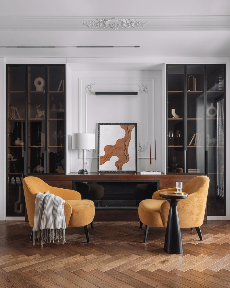 «Основа интерьера классическая — белые стены с лепниной и дубовая инженерная доска, уложенная „елочкой“. Ее мы дополнили тонкими цветовыми акцентами и современной мебелью, которая отличается простыми понятными формами».