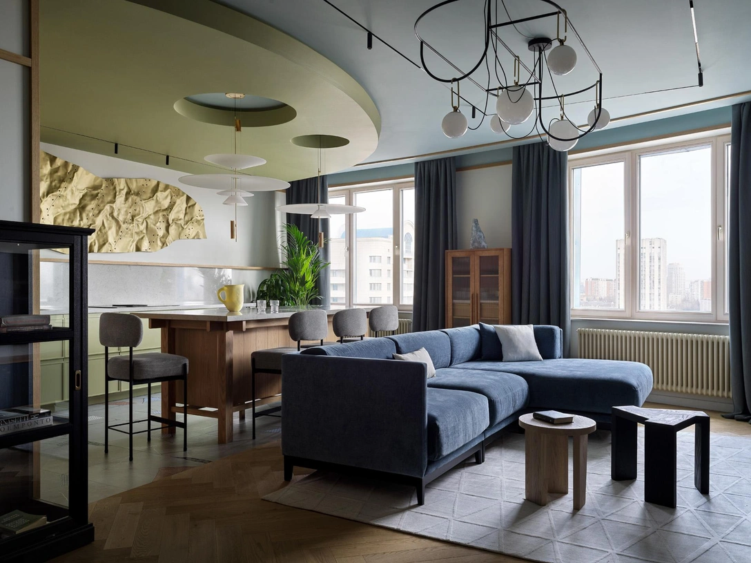 «Поскольку в интерьере достаточно много мебели и предметов декора, то все поверхности решили сделать однотонными, без выраженных текстур, фактур и узоров. Основной „удар“ на себя приняли потолки: почти везде они цветные. А стены выполнены в нейтральных оттенках».