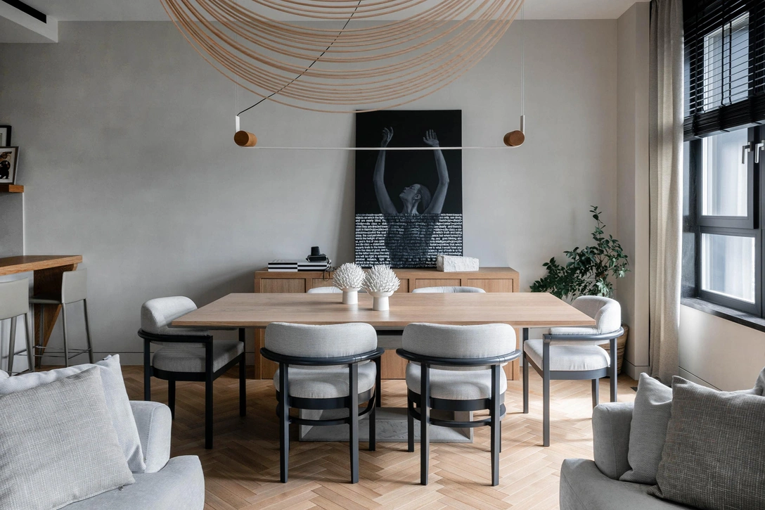 С этими заказчиками Виктория Вольвач делает уже третий совместный проект, и, естественно, им хотелось, чтобы новая квартира была не похожа на предыдущие. Квартира находится в доме на Шелепихинской набережной, окна выходят как во двор, так и на Москву-реку, и с самого начала было понятно, что вид на воду будет влиять на атмосферу квартиры. Взвесив все, дизайнер решила оформить квартиру в стиле «бельгийский минимализм», который предполагает тесную связь с местом, простоту, простор, природную цветовую гамму и натуральные материалы в отделке.