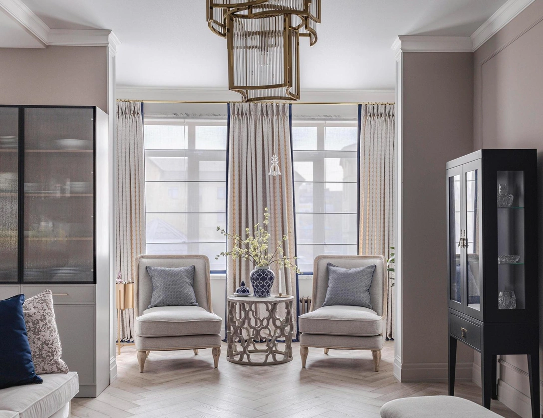 «В гостиной есть эркер, и там мы расположили отдельную зону с удобными американскими креслами — место, чтобы посидеть почитать, покурить сигару, — продолжает автор проекта. —Там мы установили бризер, естественное чистое проветривание без открывания окна».