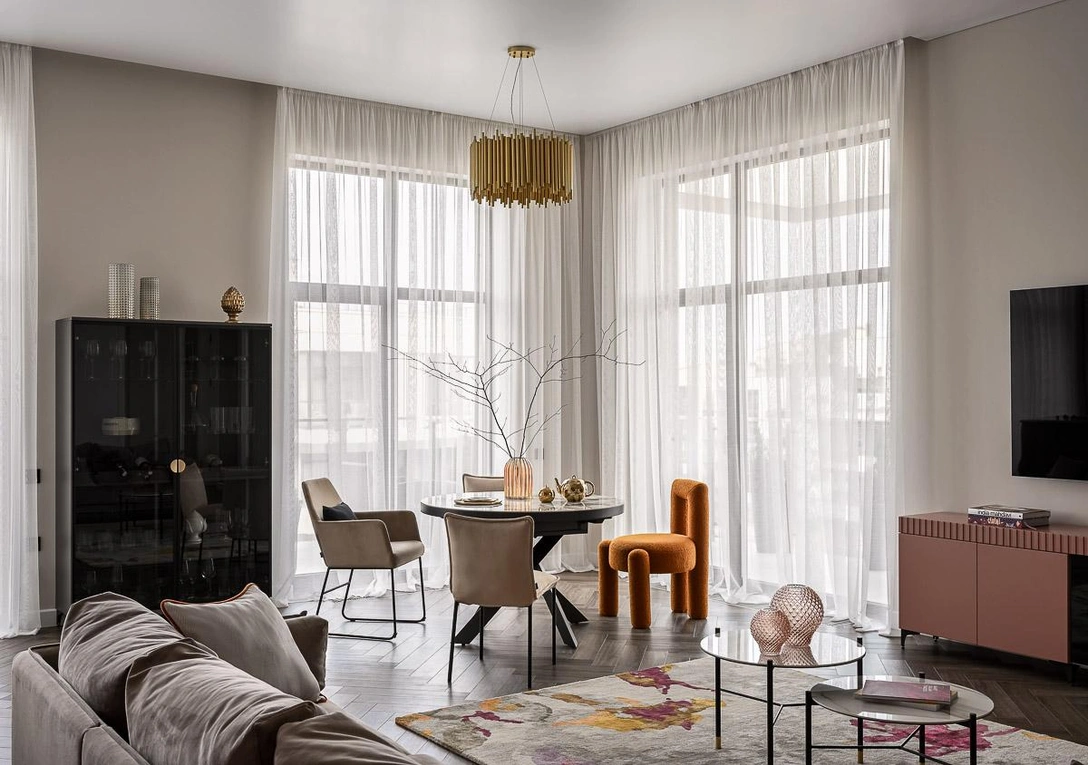 Изначально заказчики не представляли, как цветные вазы, ковры, разные стулья могут гармонично смотреться в интерьере, и были против. Согласились все это попробовать привезти с условием, что я все заберу обратно. Но в результате оставили все!