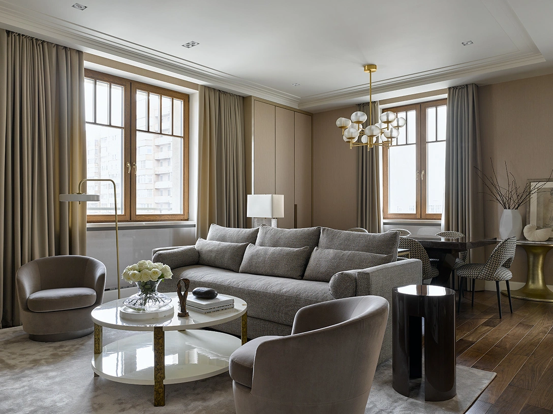 «Основным пожеланием хозяев было объединенное пространство гостиной, кухни и столовой. Нам было важно выделить каждую зону, но при этом создать целостный и гармоничный образ. Чтобы системы хранения не выделялись, мы оклеили фасады обоями в тон стен. Гипсовая лепнина, очерчивающая периметр комнаты, придает интерьеру сдержанной элегантности. Потолки пришлось опустить, чтобы провести вентиляцию, но мы обыграли ключевые места кессонами и подсветили их».