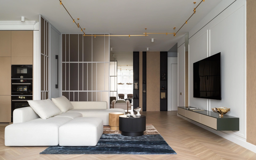 Гостиную и прихожую разделяет стеклянная перегородка с бронзовым матовым стеклом. Мне особенно нравится, как она гармонирует с холодным оттенком металла — этот контраст выглядит очень стильно.