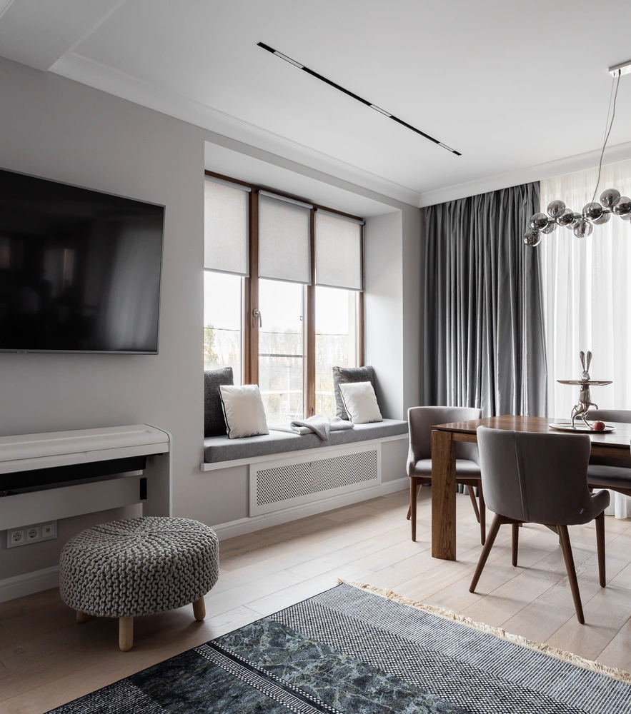«Дом расположен рядом с городским водохранилищем. Из окон открывается чудесный вид на сосновый бор. Чтобы насладиться им в полной мере, мы сделали „мягкие подоконники“, которые сразу стали главными центрами притяжения в гостиной».