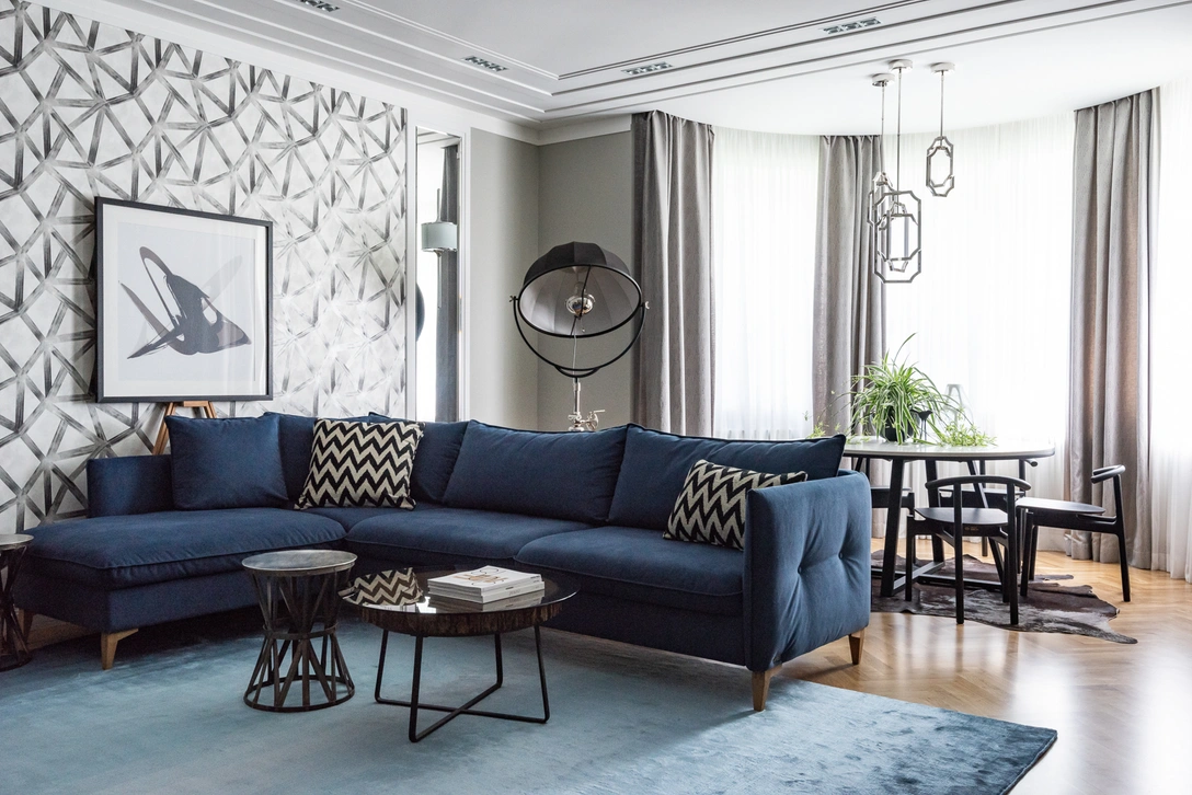 «Заказчики проекта обратились ко мне уже во второй раз. Хозяин отказался от визуализации, сказав, что он нам полностью доверяет, и зачем на это тратить время. Согласовав планировку, мы просто стали выбирать отделочные материалы, и в процессе мы выяснили, что супругам нравятся путешествовать по северным морям. Так и появились темные, металлизированные обои с китами в кухне и светильники, напоминающие своей формой корабельные лампы. Гостиную украшают обои с графикой, отсылающей к ледникам. Плитка на стенах ванной комнаты на втором этаже, похожая на морскую пену, сочетается с подвесами в виде чаек».
